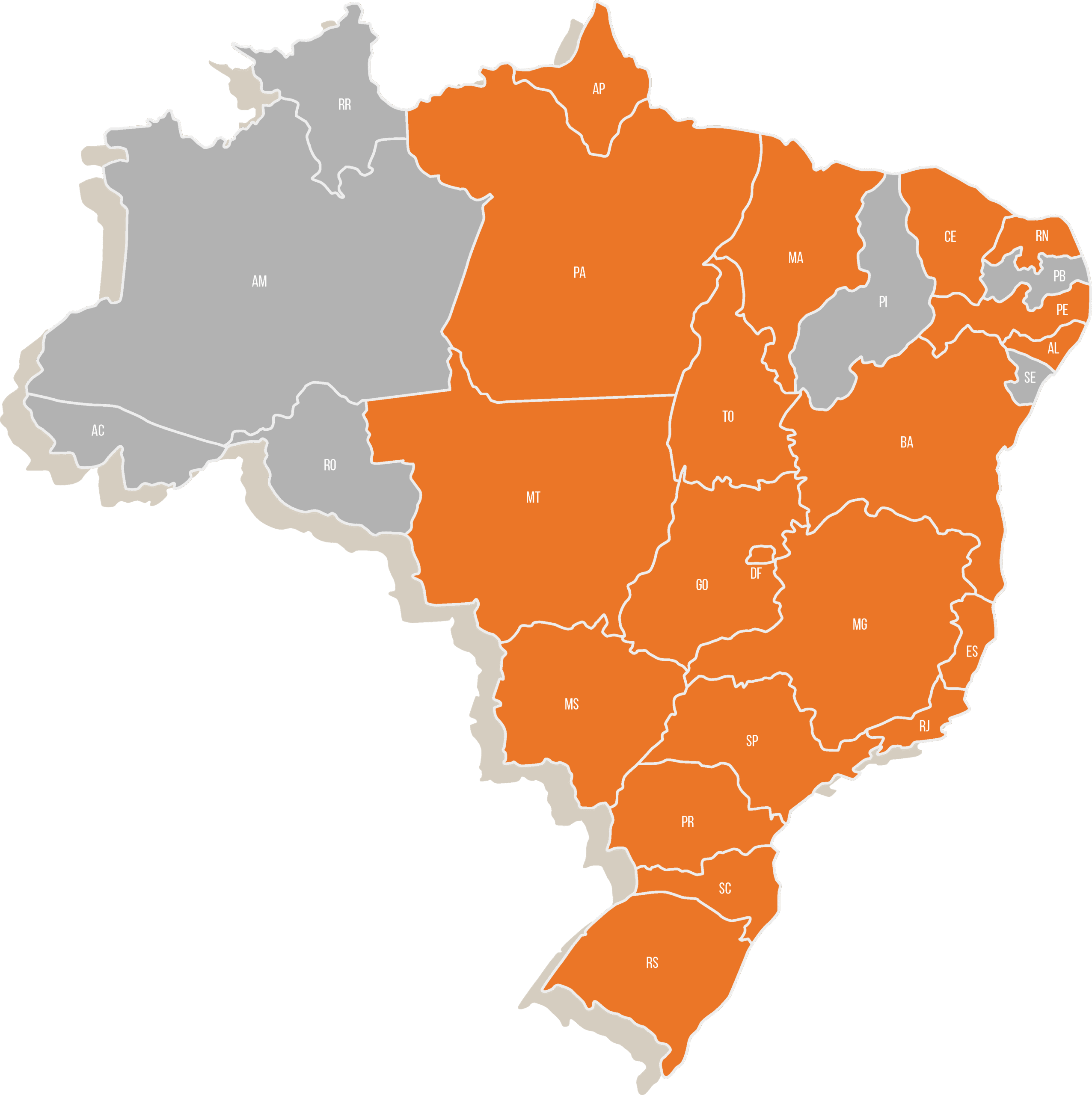 Alagoas, Amapá, Bahia, Ceará, Distrito Federal, Espirito Santo, Goiás, Maranhão, Mato Grosso, Mato Grosso do Sul, Minas Gerais, Pará, Paraná, Pernambuco, Rio de Janeiro, Rio Grande do Norte, Rio Grande do Sul, Santa Catarina, São Paulo e Tocantins.